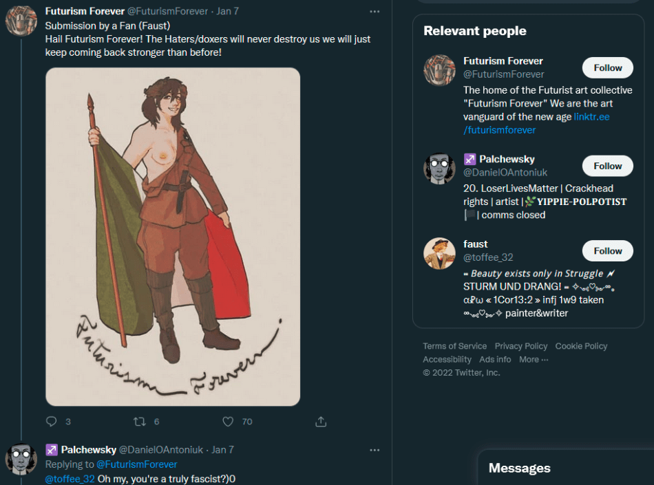 Toffee also seems to have contributed (terrible) artwork to this account (http://twitter.com/FuturismForever), that seems to be trying to resurrect Italian Futurism, most likely for its fascist history – the twitter account is full of glorification of the Italian Fascist regime, confirming Toffee’s leanings to be far-right.